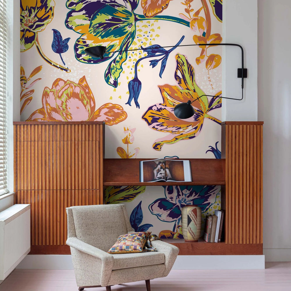 If you would like to liven up your room with a splash of colour, we recommend using strong and bold colours such as orange, red, green or mustard. Bring such a cheerful mix into your home with the flowers in watercolour of Honey. The extravagant bouquet of Wild Flowers or the statement leaves of Colored Leaves wallpaper steal the spotlight on a light background.