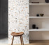 The playful Terrazzo wallpaper is inspired by the trendy Italian natural stone. With white as the basic color, it is finished with unique pebbles in red, blue, black and purple. The combination of the different shapes and colours turns your wall into a spectacle of mosaics.